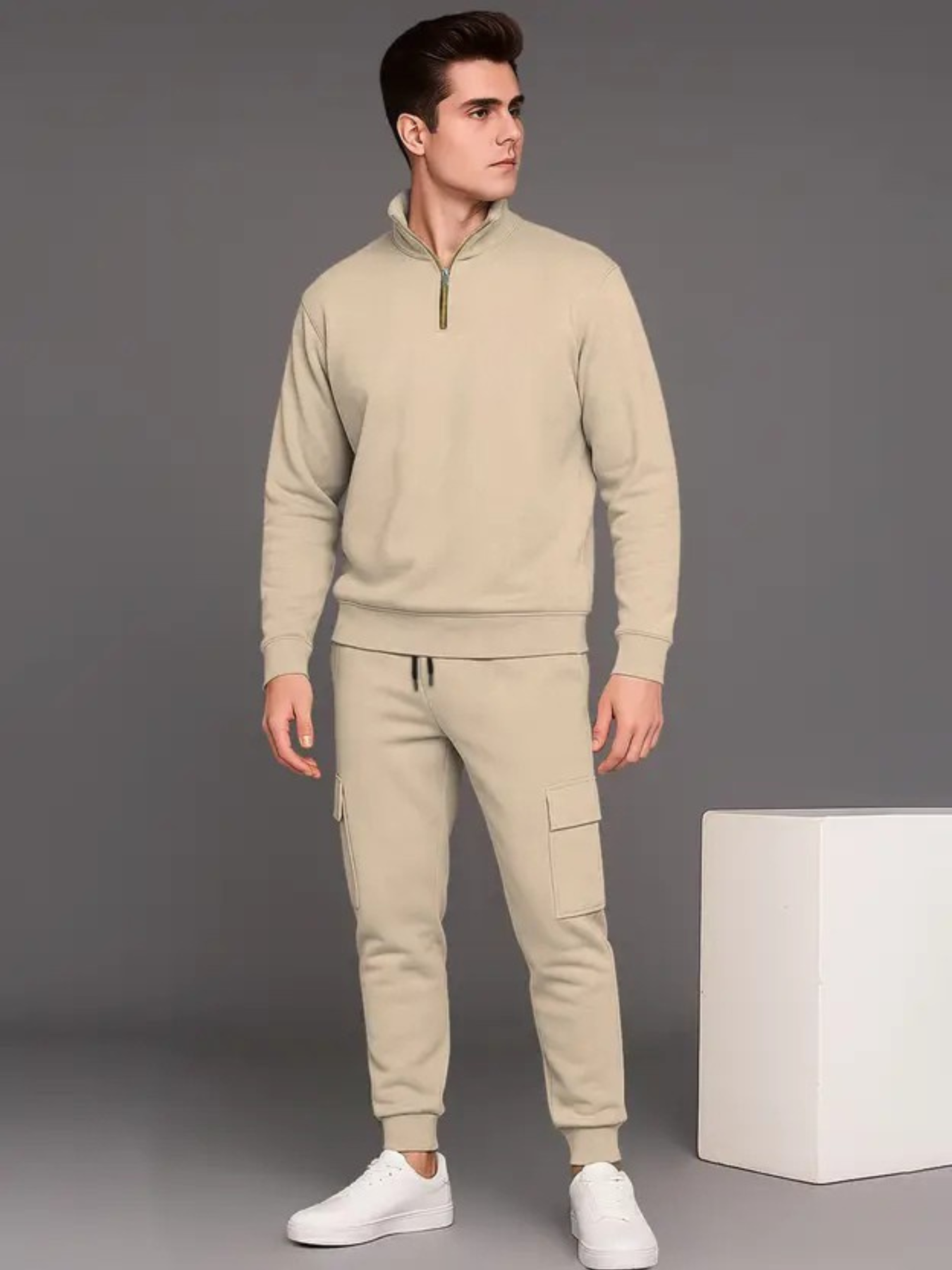The zip-neck sweatshirt adds a sporty edge while allowing adjustable comfort, and the matching joggers feature functional cargo pockets and elastic cuffs for a clean, contemporary silhouette. Finished in a timeless beige tone, this tracksuit delivers effortless style with all-day comfort.